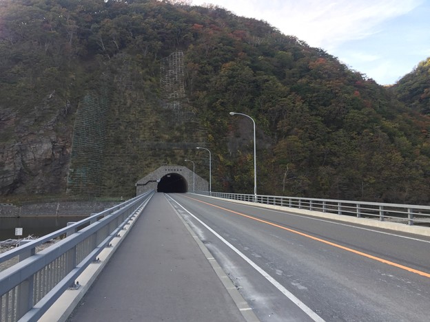 ▼標高60mまで下がって、また湖まで登りが続く。豊似湖まで2.1km