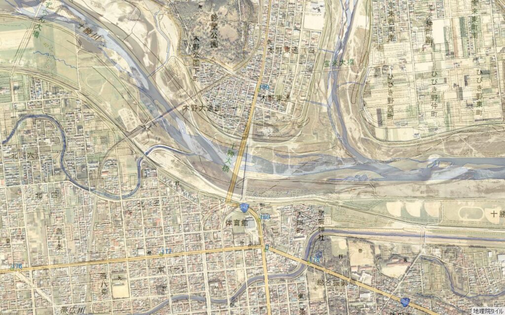 十勝川を渡河する薄い黄色いラインが1996年開通した「十勝大橋」(橋長501m)であり、帯広市の西二条通りに南下接続している。空撮写真にある旧「十勝大橋」(橋長369 m)は、現橋の下流に架橋されていて、その延長線上は帯広警察署のある帯広市の西一条通に向かっているが、直接接続しておらず、橋梁の帯広側でY字型の交差点となり西二条通りと大通りに向かって分岐し曲線で結ばれていた。