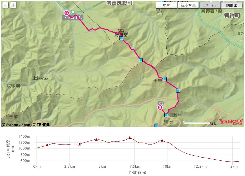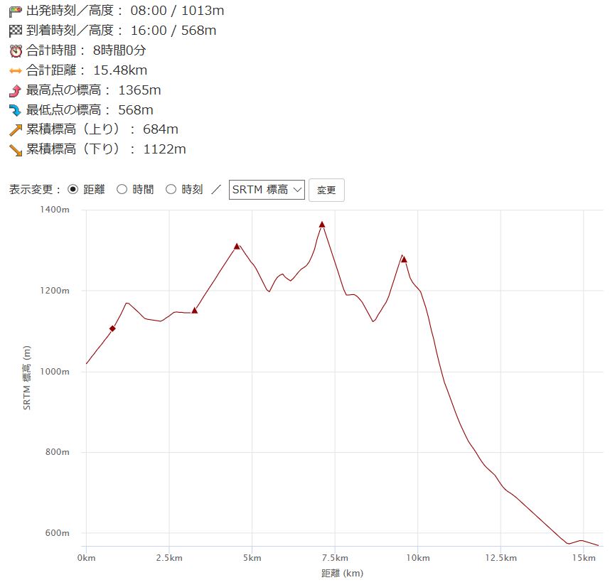 最低/最高高度: 569 m / 1386 m (高度差817m)