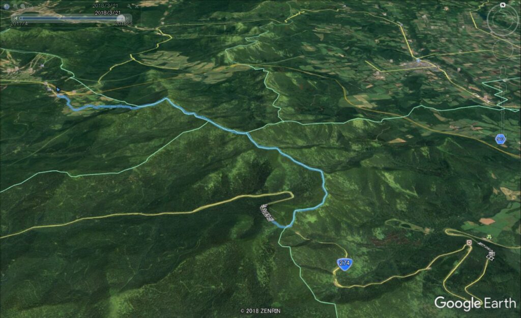 ▼台風10号の被災により撤去された「三国の沢覆道」の出口あたりの一般国道274号が見える。