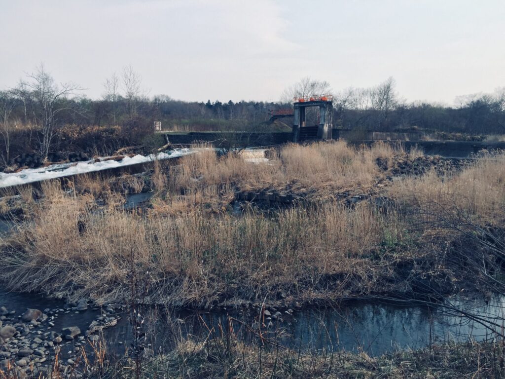 ▼JR千歳線の下はくぐれる。釣り人あり。