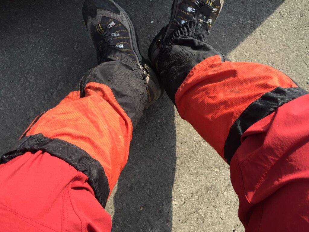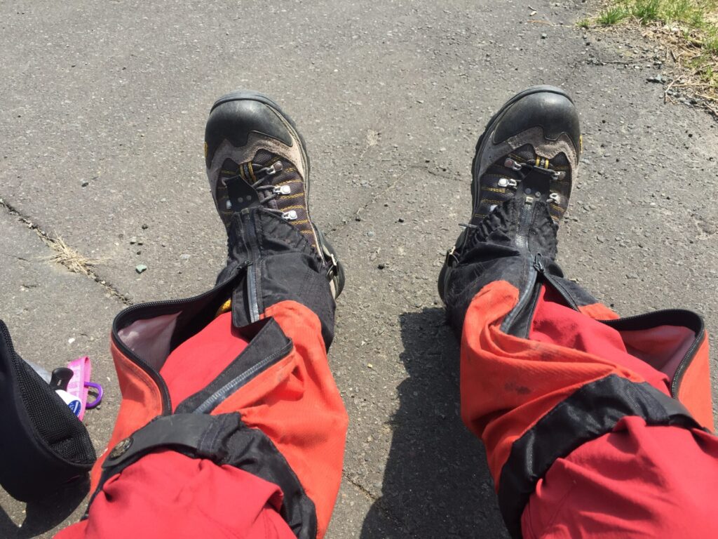 ▼日高山脈を横断した松ヤニだらけのスパッツ。夏でも冬用を使う。丈夫だし、空気を入れる事が出来るから。