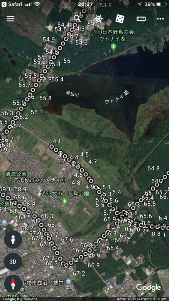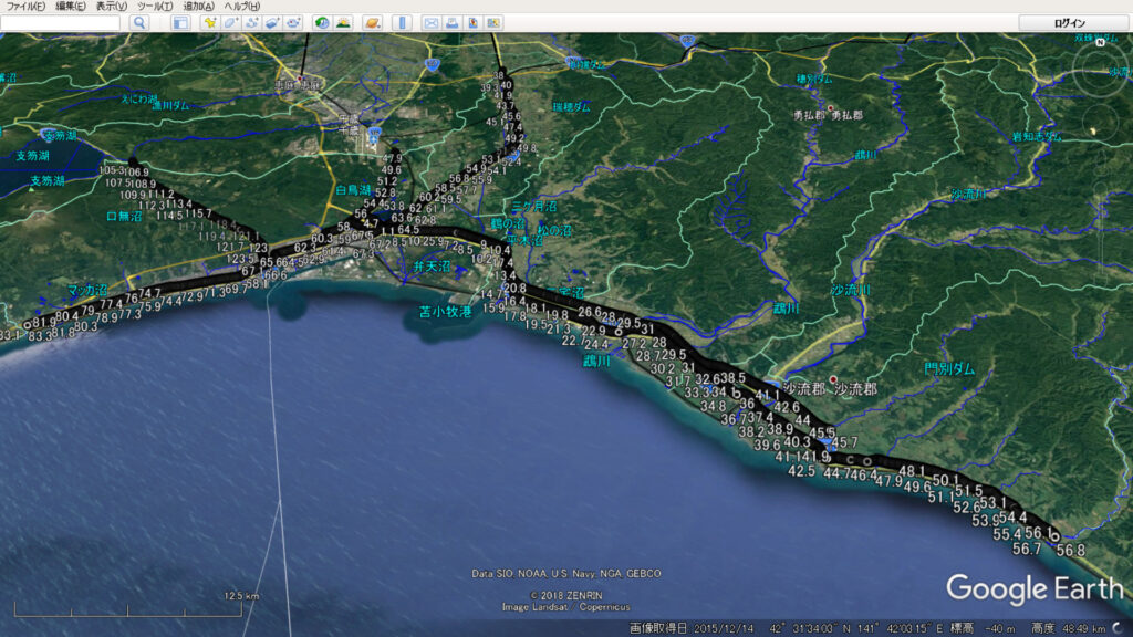 ▼DLしたKML形式データは、Google Earthにドロップするだけで、この画像のように表示される。