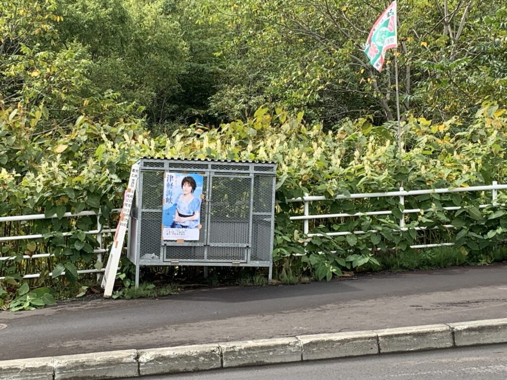 ▼ゴミステーションに貼られた宣伝ポスター。本人は複雑な心境であろう。