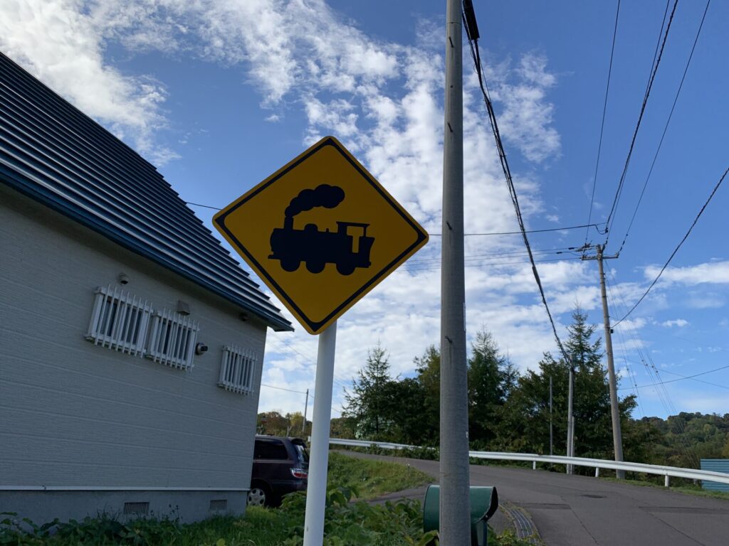 ▼汽車たいぷ踏切警戒標識があり、左にカーブすると、