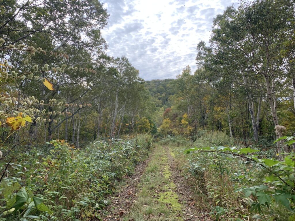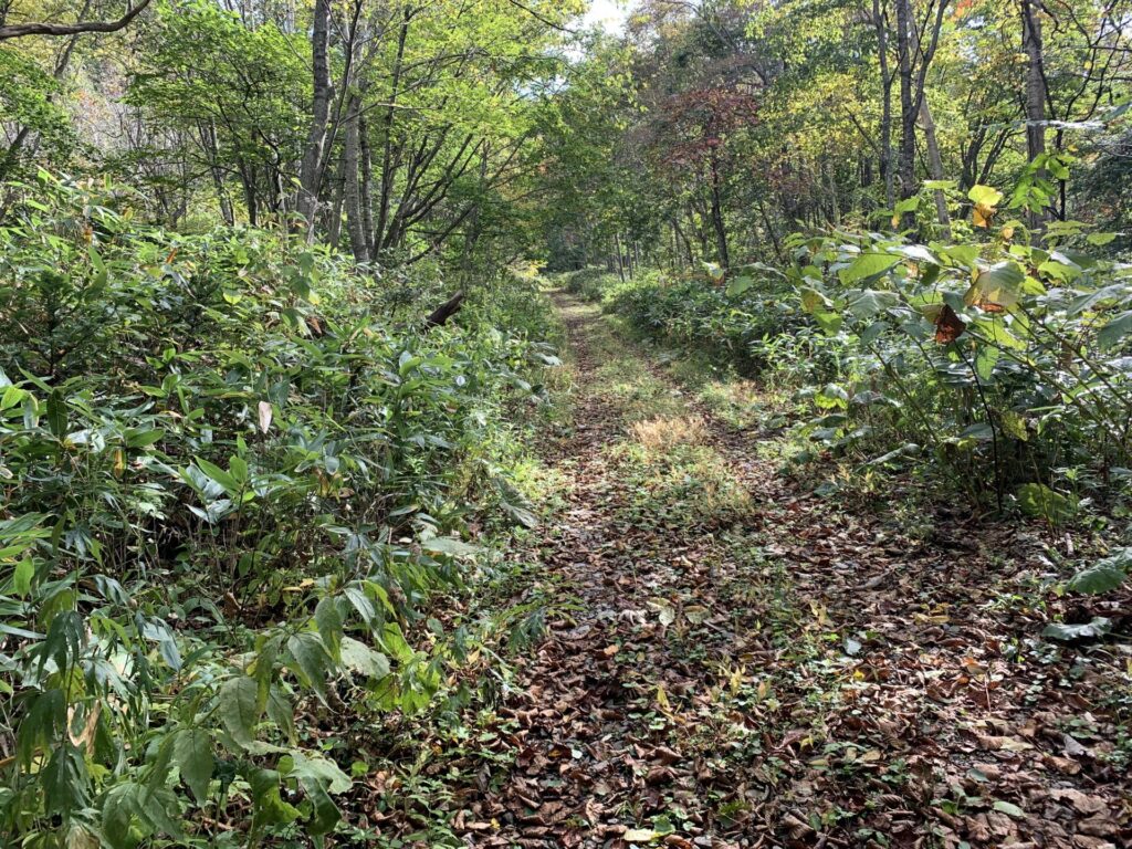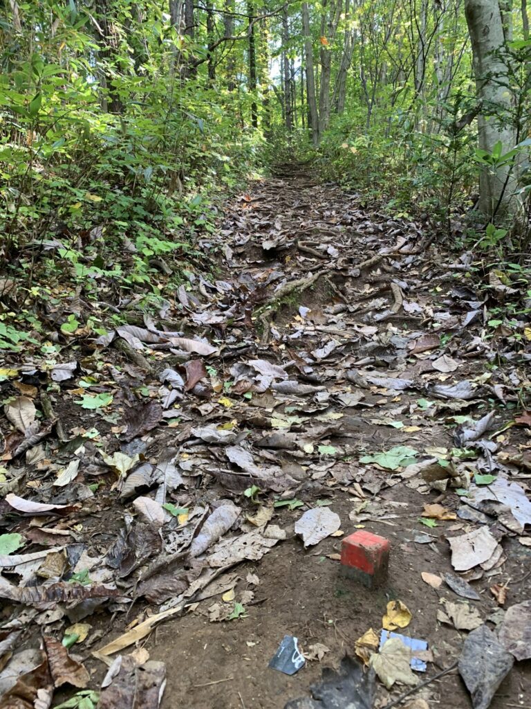 ▼歩きやすい土砂道。何故か用地杭らしきものが所々にある。ゴミも多い。