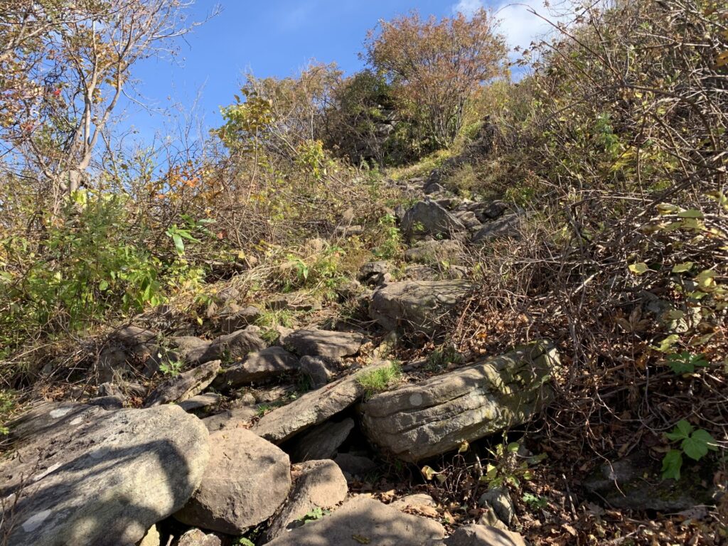 ▼位置:ここから右に曲がり、於古発山(おこはちやま)へ登り返す。