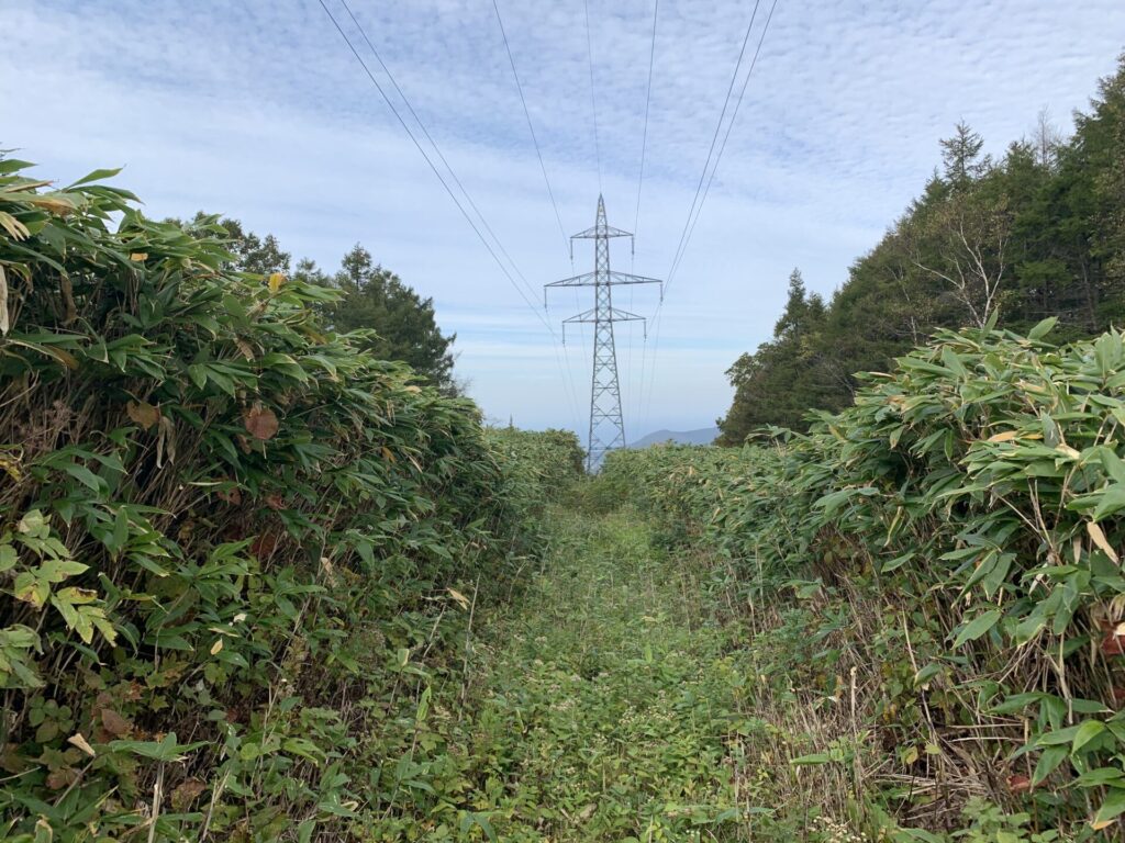 ▼交差する送電線の下は綺麗に刈ってあるから皮肉だ。
