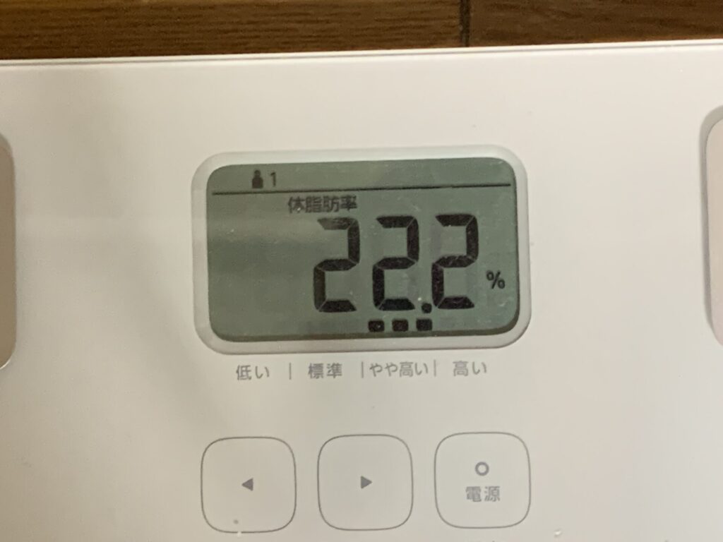 ▼体脂肪率22.2%、体重72kgの時は24.5%だった。20%を切りたいな