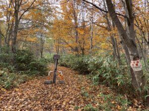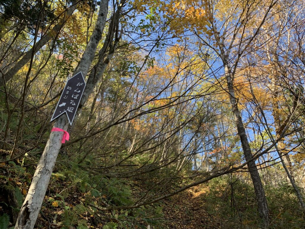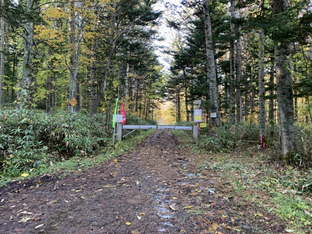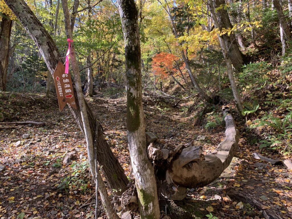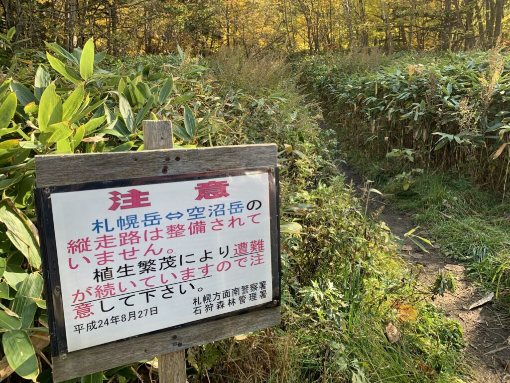 ▼冷水コース登山口に着いた。この注意書きにあるように、空沼岳への縦走路は刈り込みがされていないそうだ。