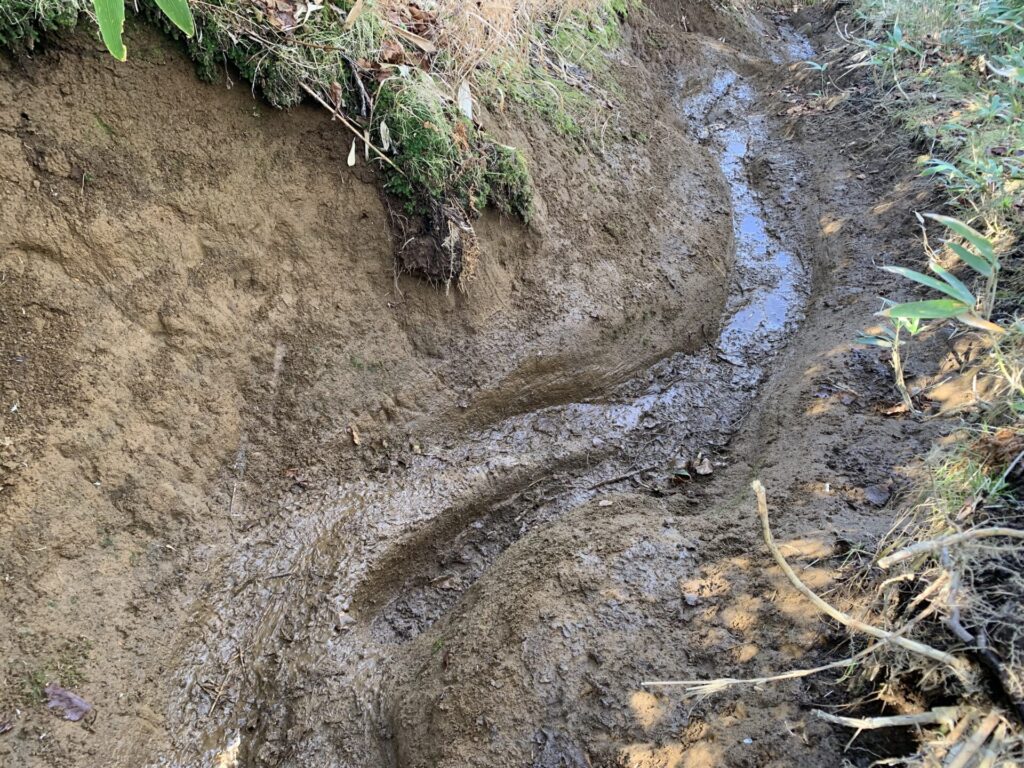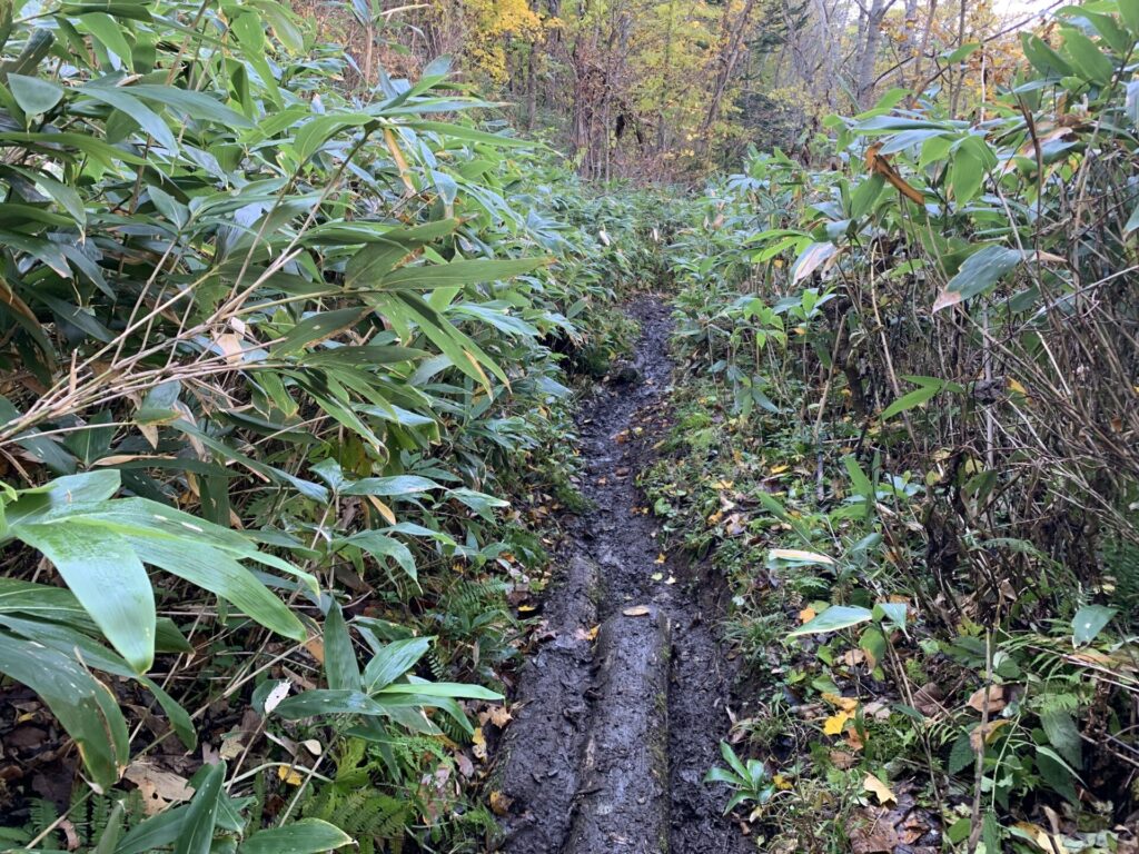 ▼爽やかな林間だが、足下は泥:下りのコースでは15人ほどとスライドした。
