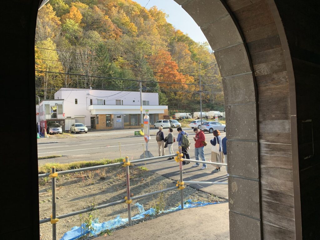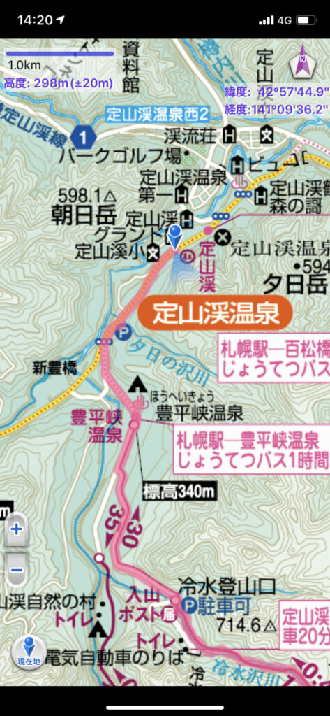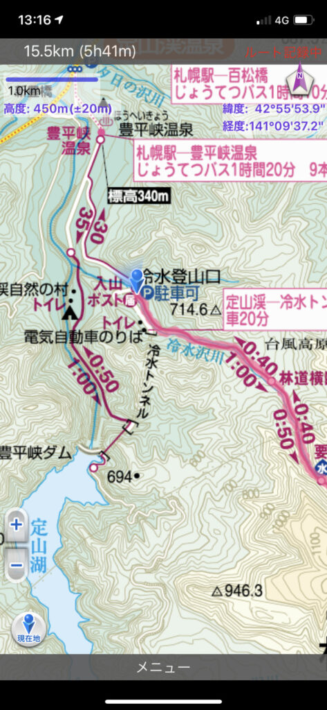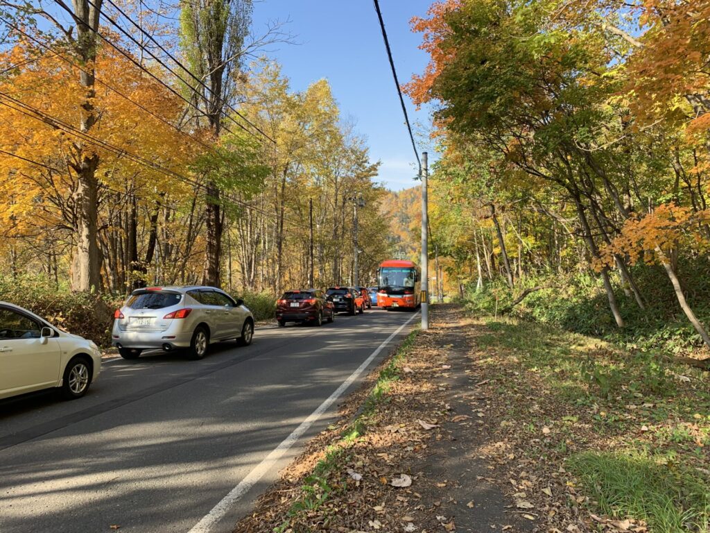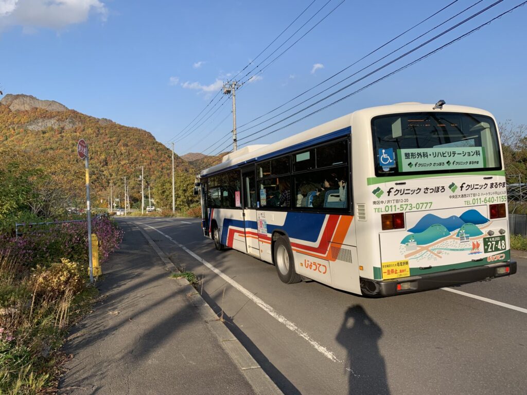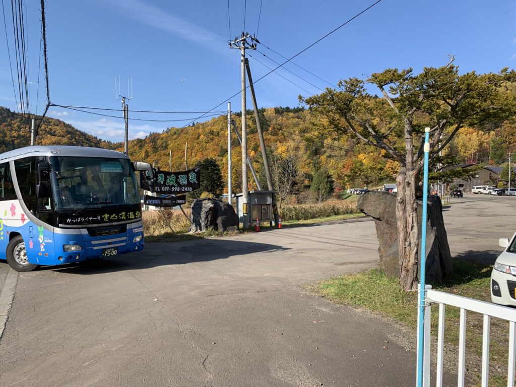 ▼豊平峡温泉の前にバスが入ってきたので、バス停の時刻表を確認したが、路線バスでは無いようで定山渓まで歩くことにした。