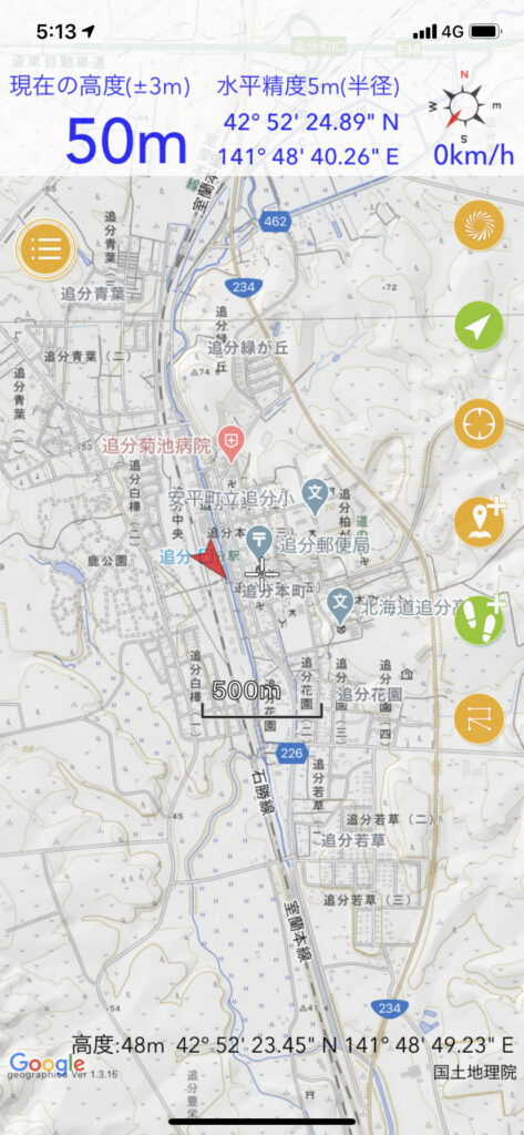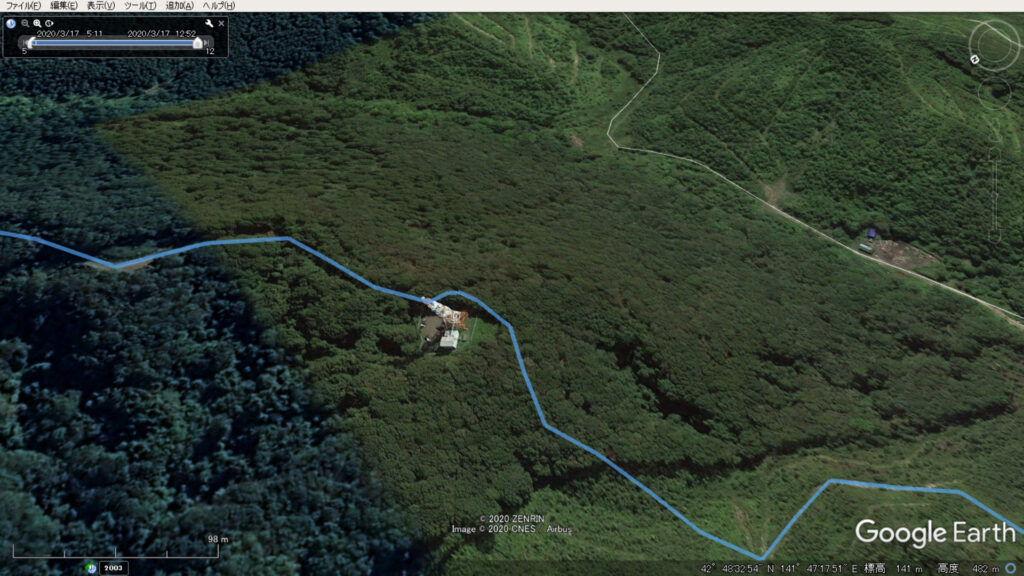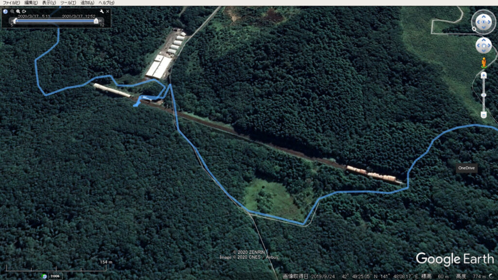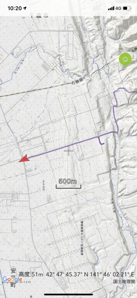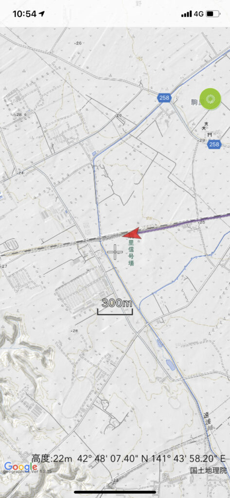▼鳥瞰図:左が追分駅。西早来信号場は盲腸にラインになって居る部分。そのそばに匂いの発生源の白い建物がある。森林の密集度から夏場は草刈機を持参しないと通り抜けは不可能!