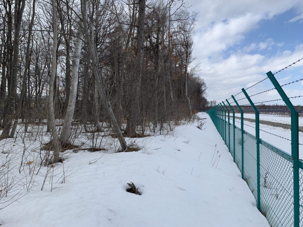 ▼あまりのとげとげの藪に逃げだし太陽光発電の敷地沿いに延々と歩く。