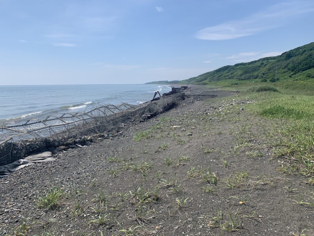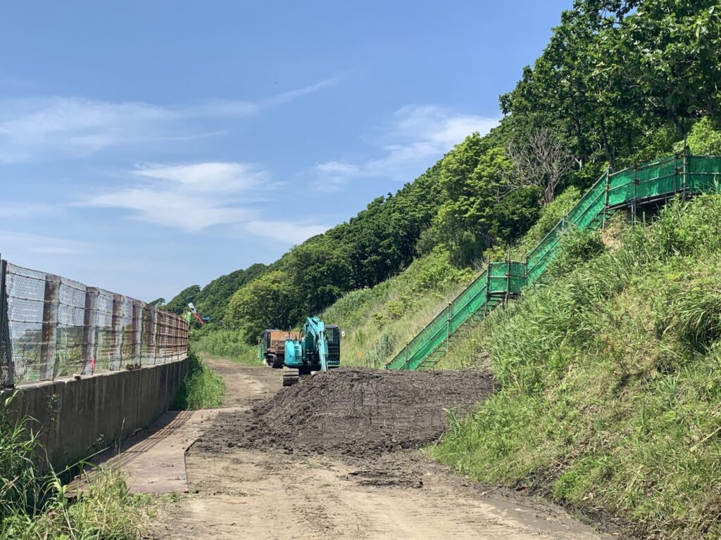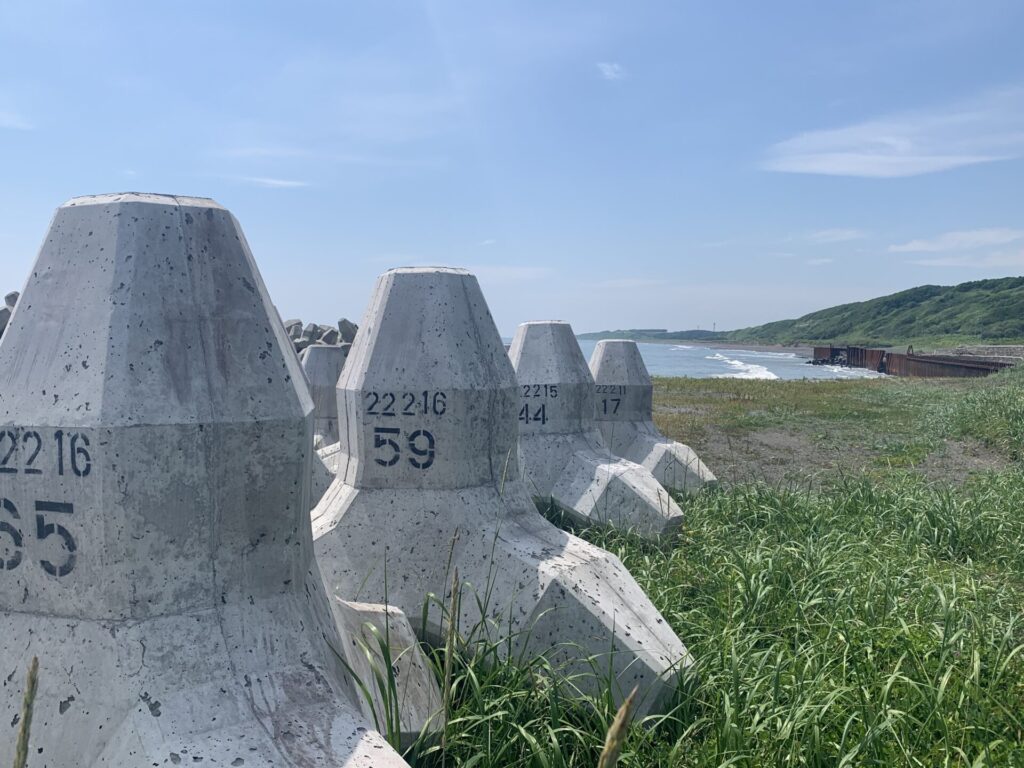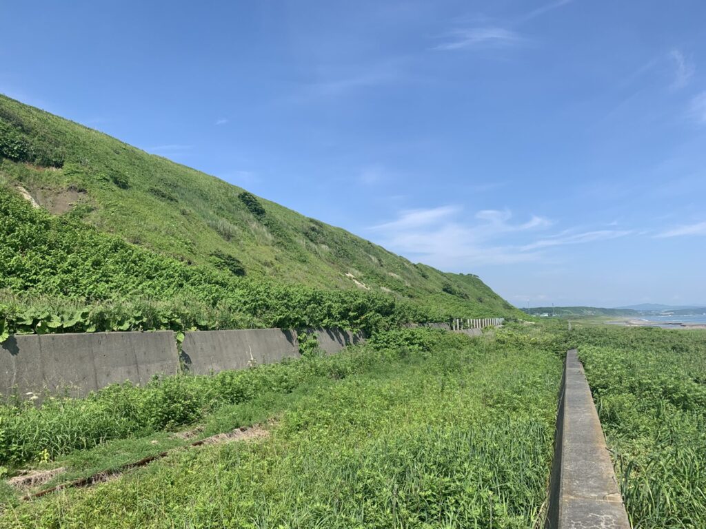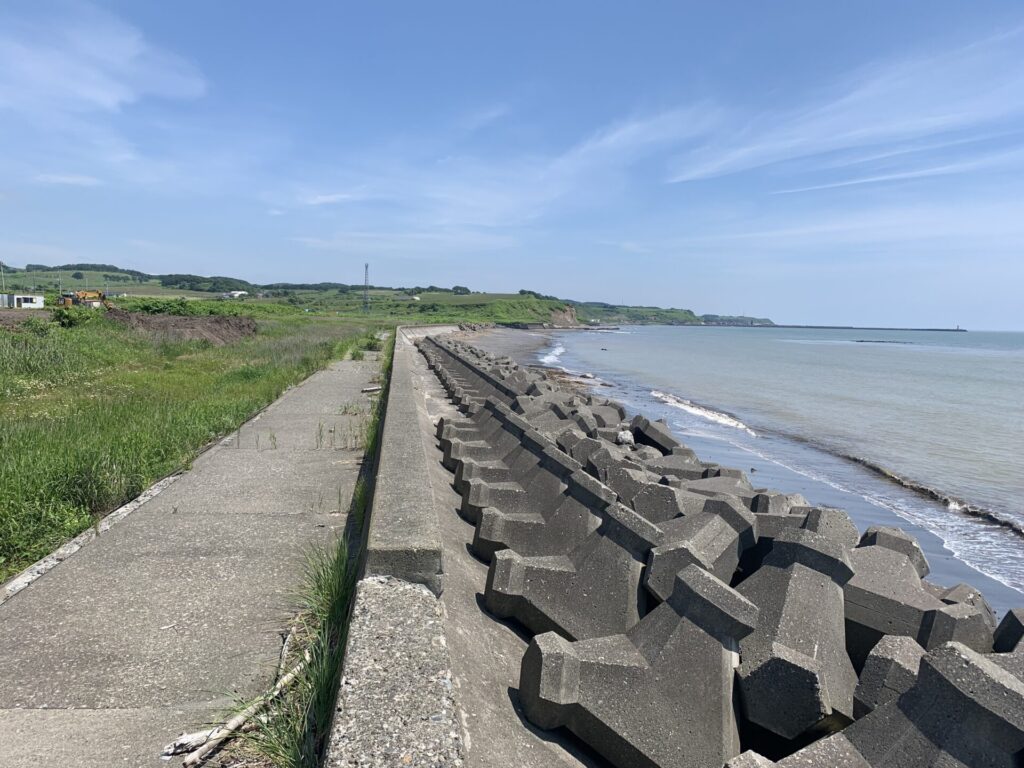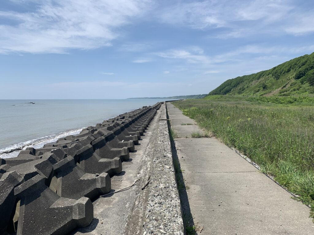 ▼海岸へ向かう 海岸擁壁の天端を進む。
