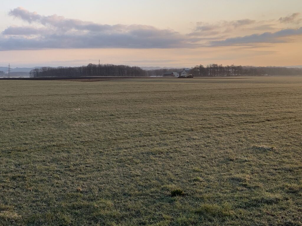 ▼開けた牧草地が隣接。遠くに柏原工業団地の白い工場がみえる。