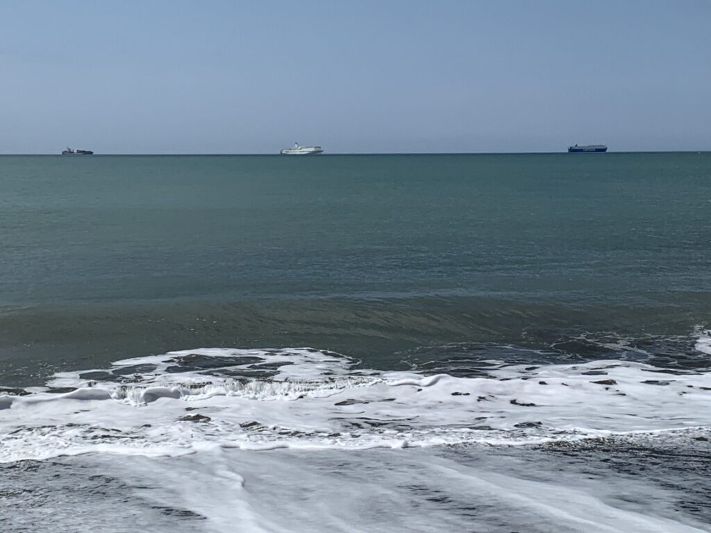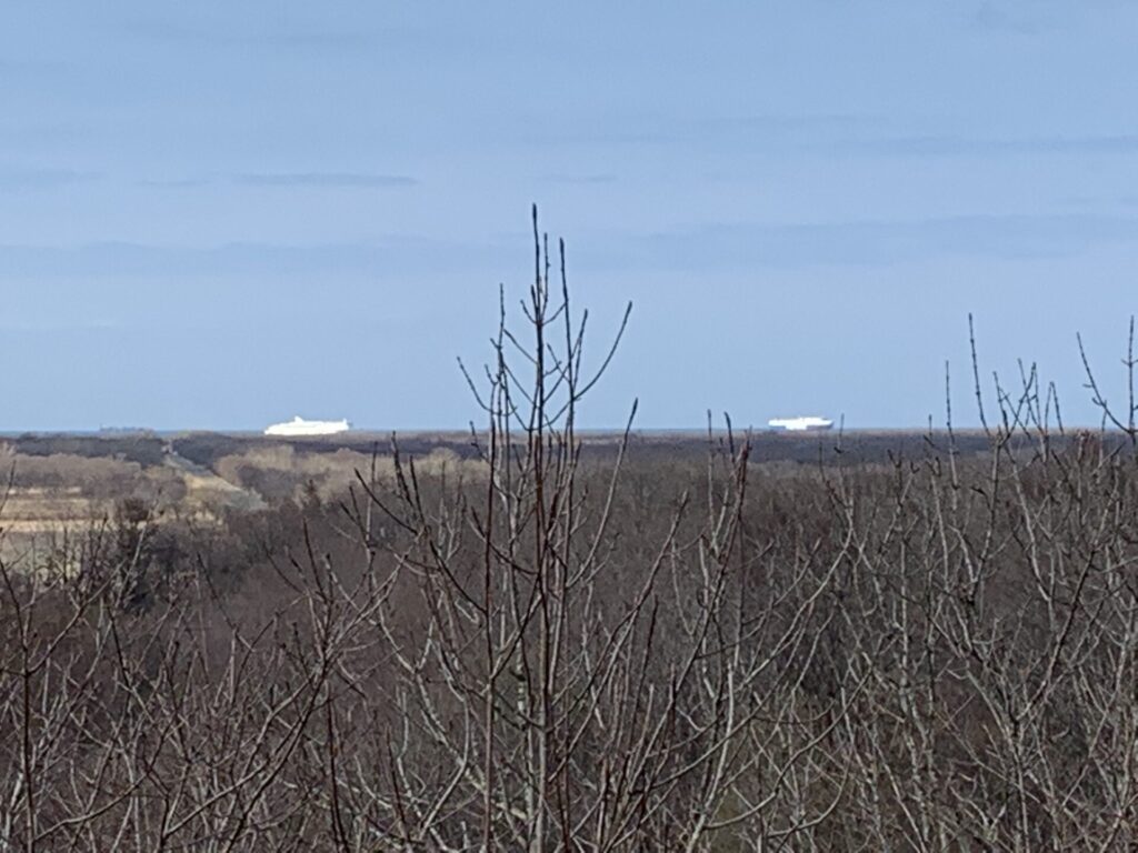 ▼弁天展望台で見えた沖合に停泊する船舶。