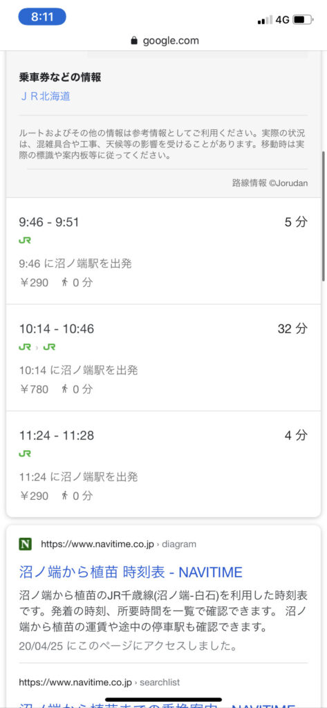 なので、11:24までに沼ノ端駅に着くような道南バスを調べたところ、勇払駅前9:54のバス便があるので、これに変更に決めた。