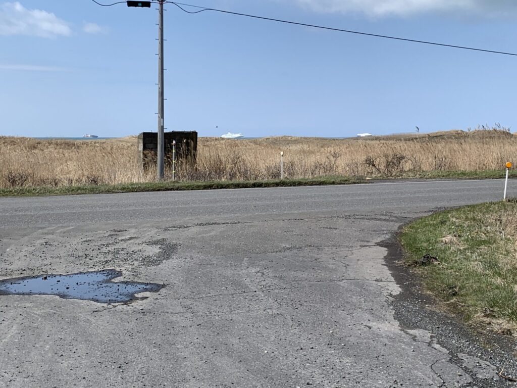▼右へ曲がると、昔小学校の遠足で使っていた経路。海岸沿いの道がかつて一般国道235号だったころは、樹海ロード(一般国道274号)も道東自動車も無かったので、道東に向かう車両は、この海岸沿いの一般国道235号(現在は市道)を通過していた。