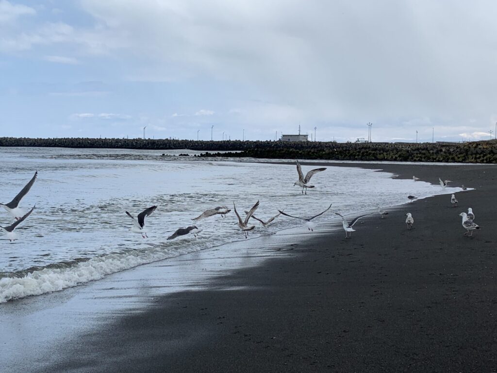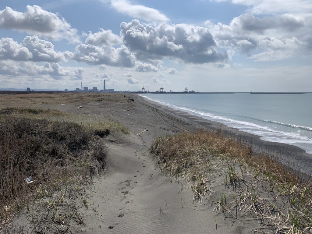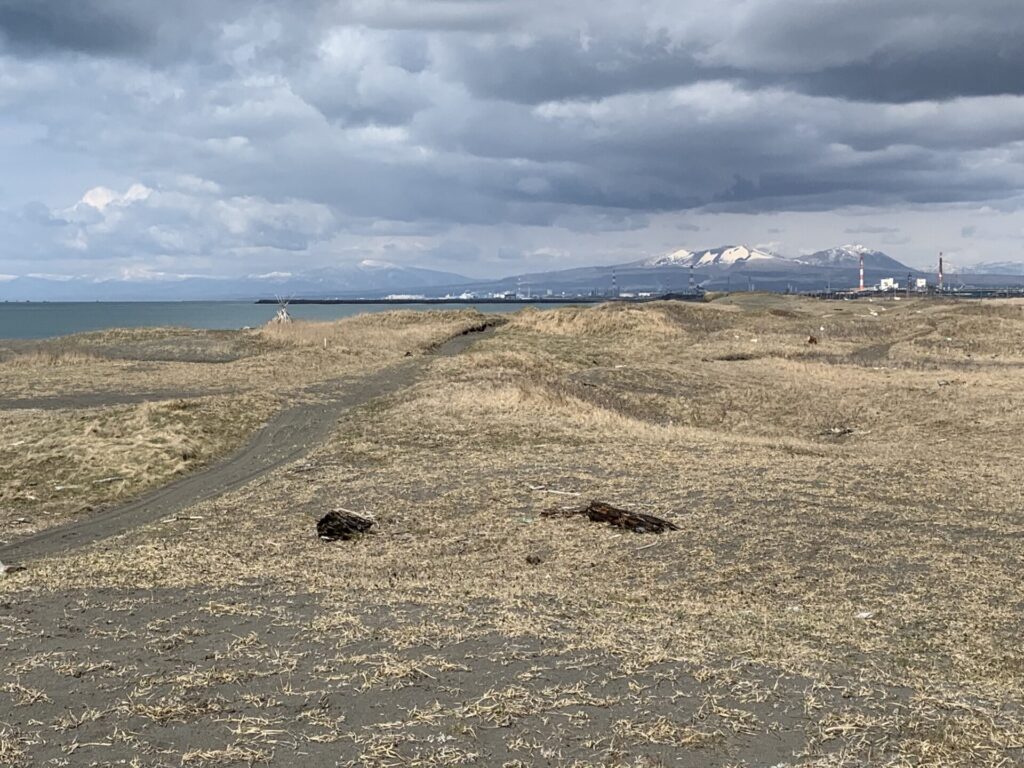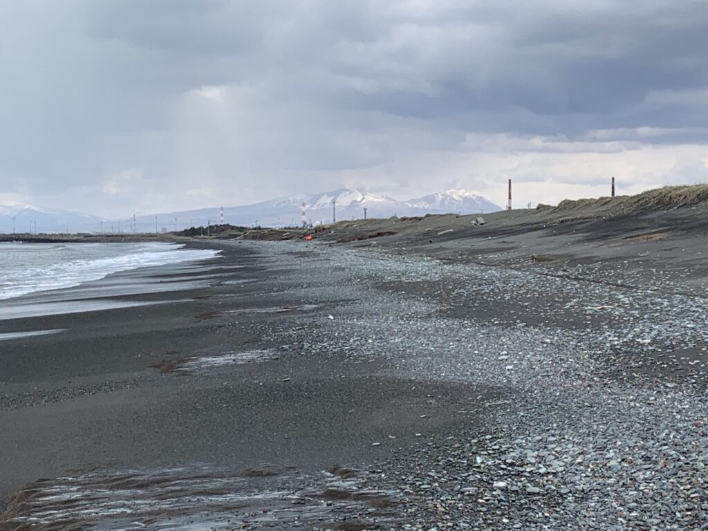 ▼海岸まで行き、これから進む勇払方向をみる。樽前山の山頂は白い!