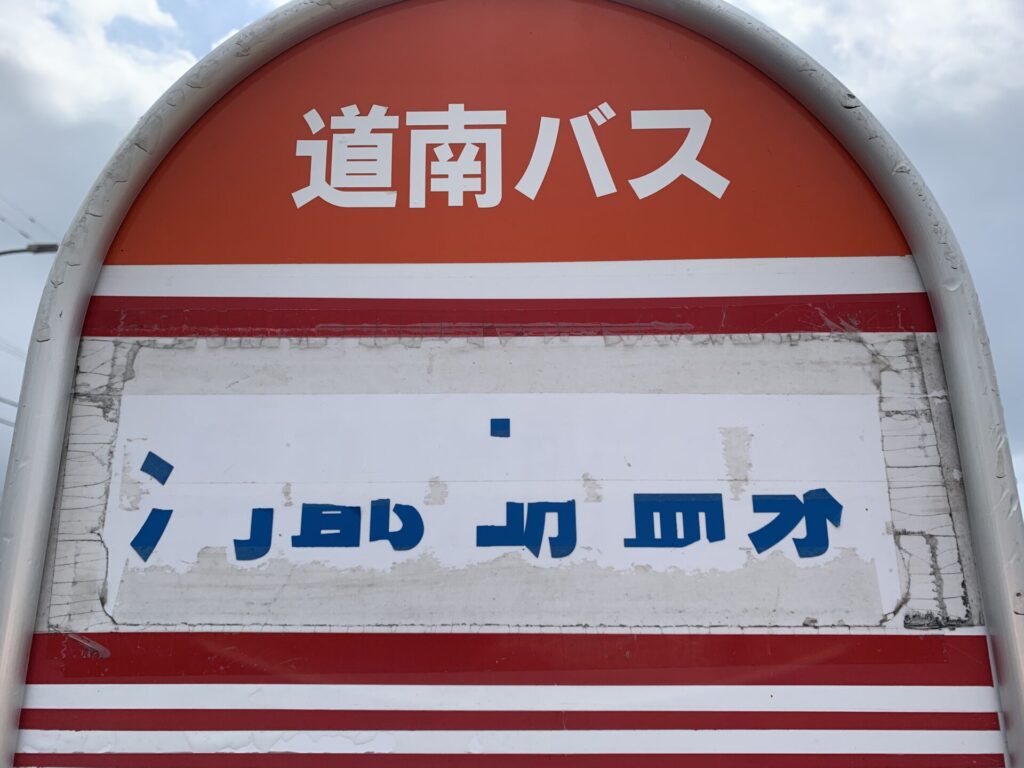 バス停の名称が剥がれいる。