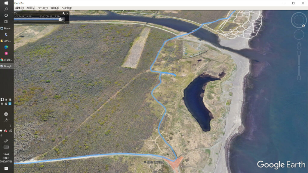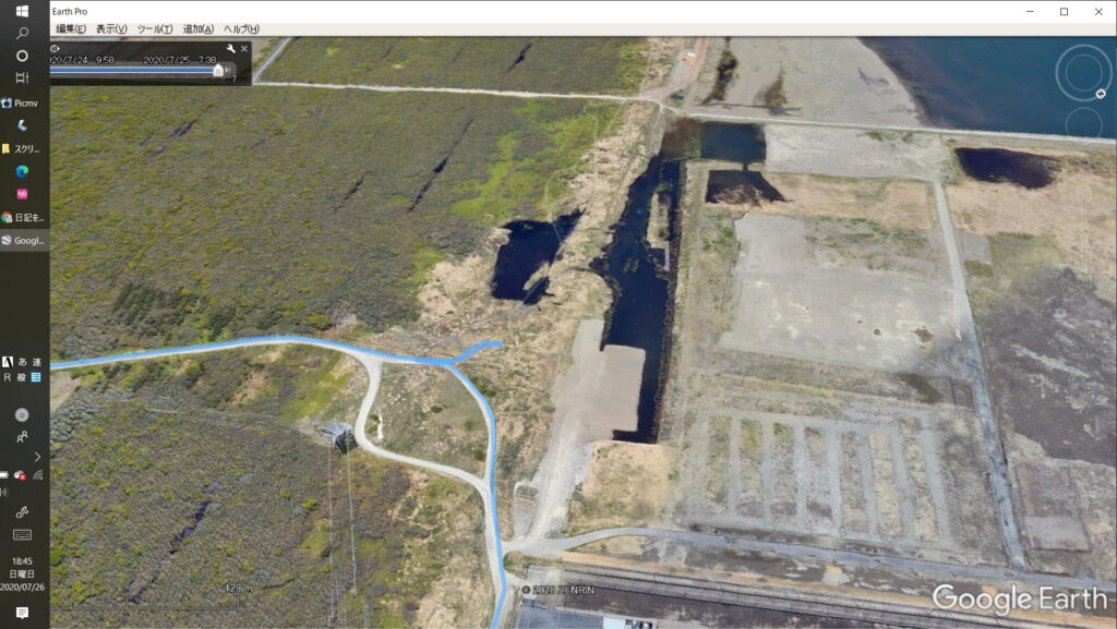 ▼Google Earth:植生の色からして藪が深いようには見えないが…