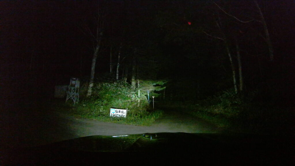 ▼その先を細いが舗装された道路を進むと、登山口があり、さらにその先100mに駐車場がある。すでに4台ほど就寝中である。
