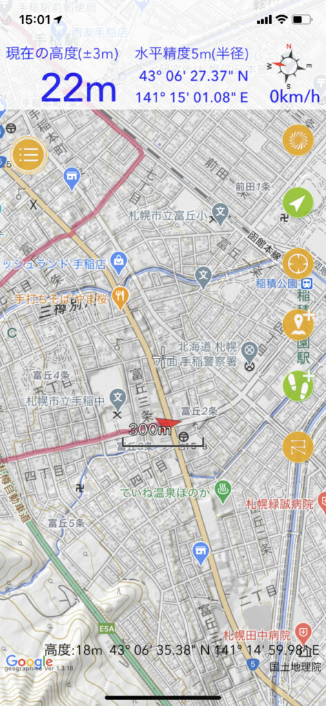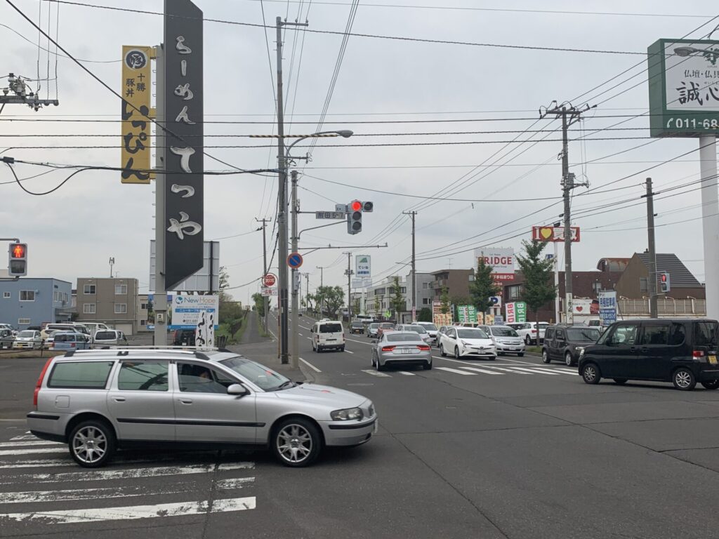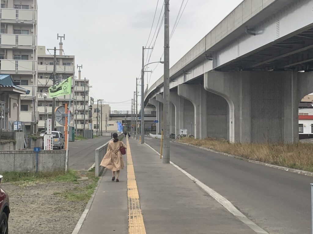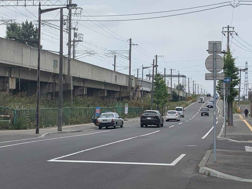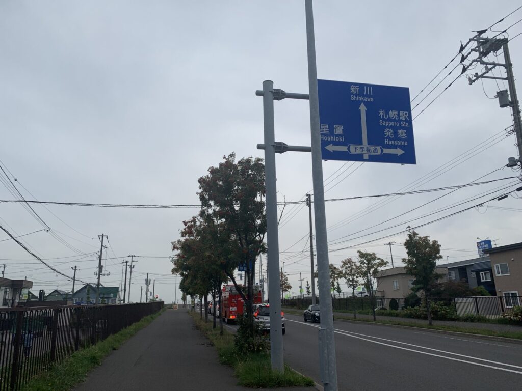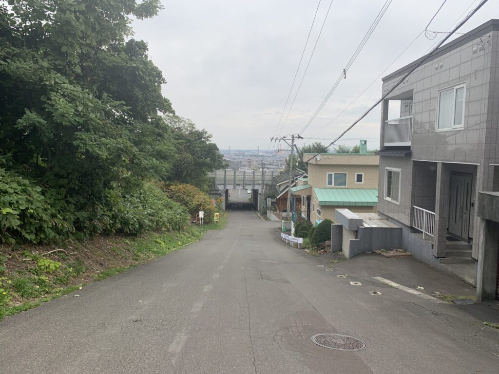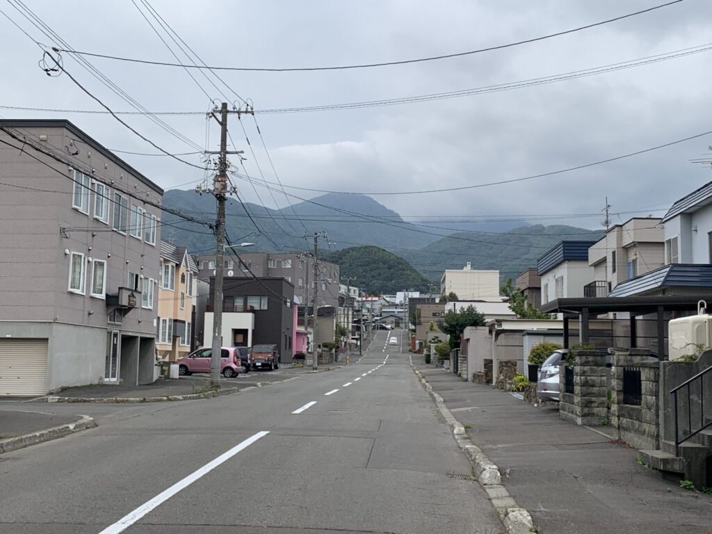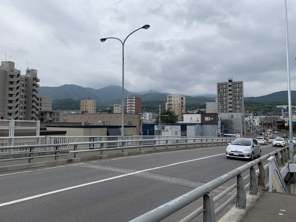 ▼石狩手稲通りの跨線橋から丸山が見えてきた。丸山は左側の手前のかすんでない小さなやまである。