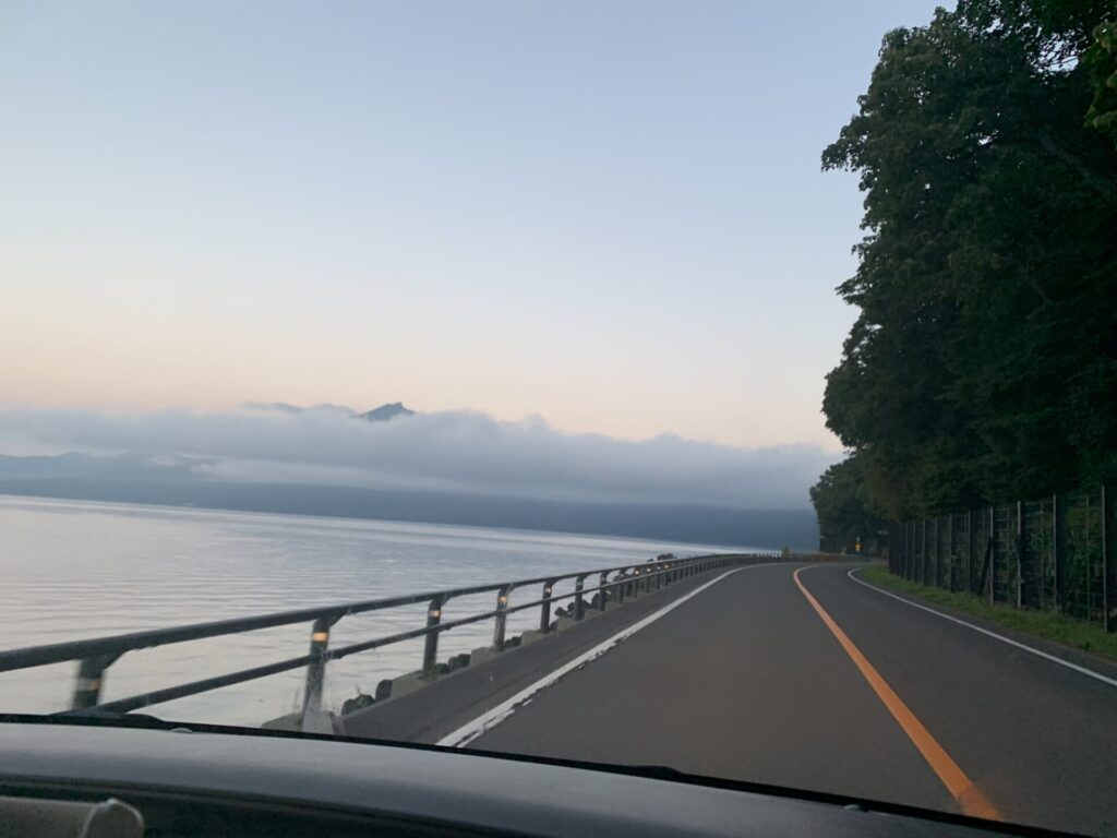 支笏湖沿いからの眺め、雲の中から恵庭岳の山頂が顔を出していた。