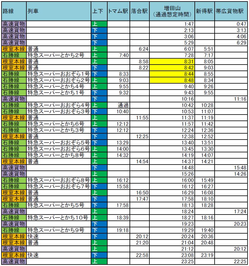 撮り鉄の聖地増田山の列車通過時間を予測してみる。(1)落合駅-新得駅(根室本線)とトマム駅-新得駅(石勝線)の特急列車や普通列車などは、おおよそ駅間の丁度真ん中と想定して時刻表の各駅出発時間を1/2して算出してみる。(2)高速貨物列車は、WEB... -