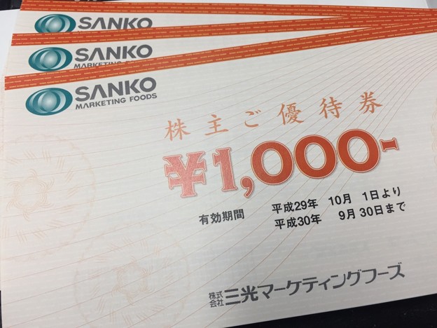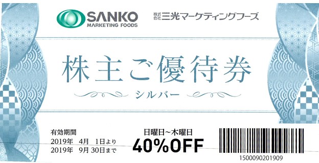 今日届いた株主優待「三光マーケティングフーズ」▼株主割引券【シルバー】*6枚 20200325_154608 posted by (C)ミント専門官 この会社は本州でレストランなどを営業しており、その食事の割引券だが、北海道には店がないので、券を送り返すとカレーか米券... -